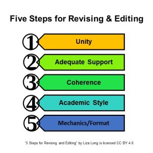 Have your ever been told to “revise” your paper or to “edit” a peer’s paper? What do these words mean? Just as writing is a process, effective revising and editing also involves several steps. If you focus on one step at a time and take a break between steps, you’ll be able to make sure that your paper includes all of the required elements in the right order and that your academic style is confident and competent.